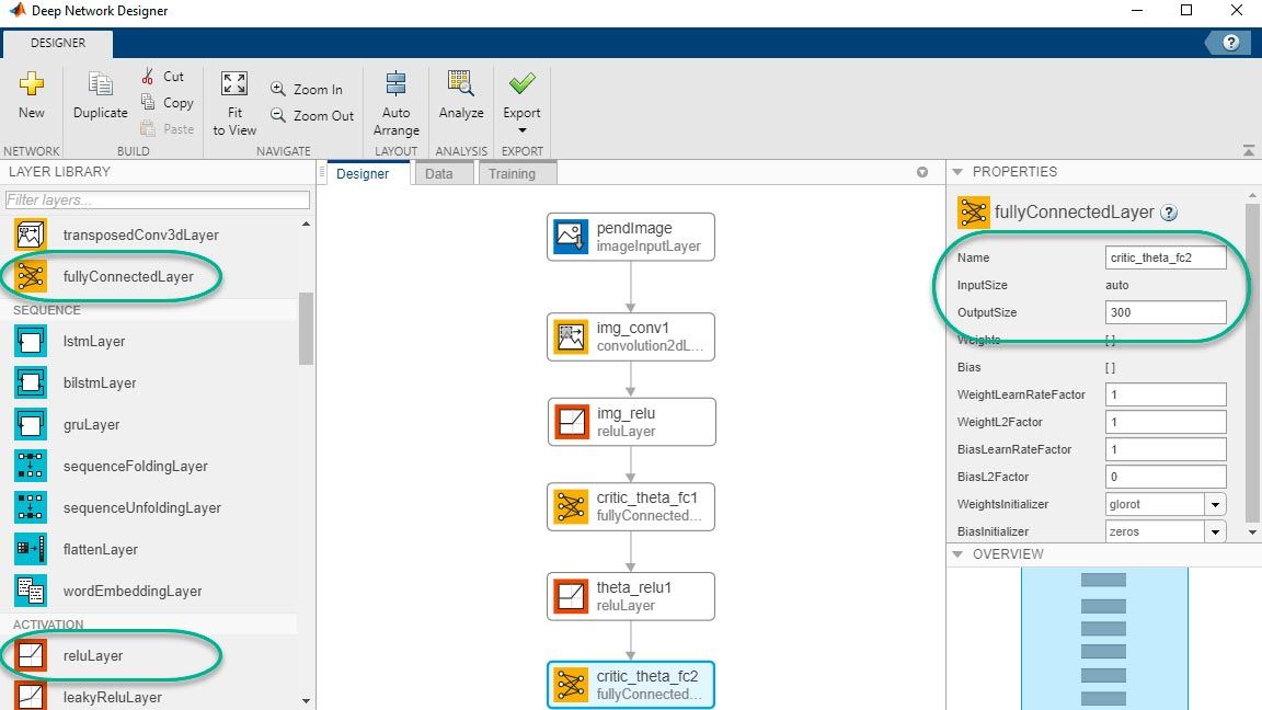 Use problem-specific, auto-generated neural network architectures to create deep reinforcement learning agents without being an expert in designing neural network policies. Use the suggested neural network architecture as is, or fine-tune it with the Deep Network Designer app (interactive approach) or layers from Deep Learning Toolbox (programmatic approach). Apply import and export capabilities to interoperate with neural networks representations in third-party frameworks.