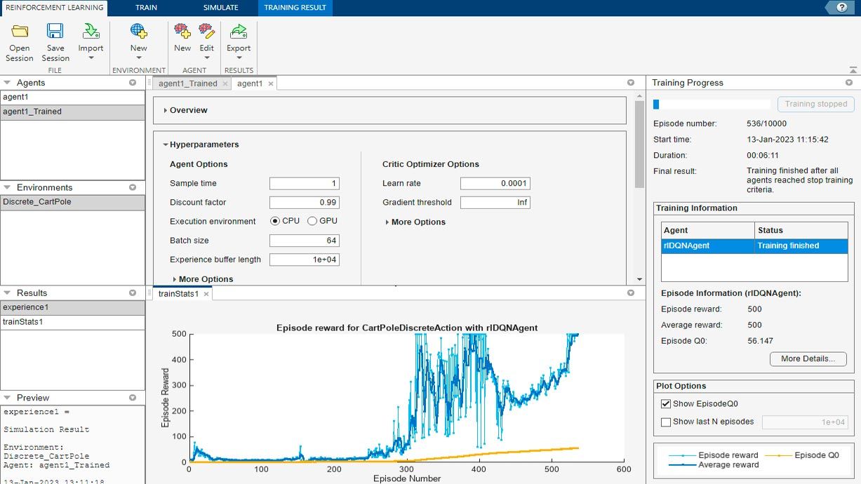 Create, train, and simulate deep reinforcement learning agents interactively with the Reinforcement Learning Designer app. Take advantage of automated guidance for selecting the appropriate agent type. Select from popular deep reinforcement learning algorithms provided out of the box, such as deep deterministic policy gradient (DDPG), soft actor critic (SAC), and proximal policy optimization (PPO). Model the training environment in Simulink (or MATLAB) to reduce the risk of damaging your hardware. Seamlessly integrate environment models with deep reinforcement learning agents using the RL Agent block. Train policies in series or in parallel and verify them through (system-level) simulations and software-in-the-loop (SIL)/hardware-in-the-loop (HIL) tests. Deploy trained policies to embedded devices or the cloud.