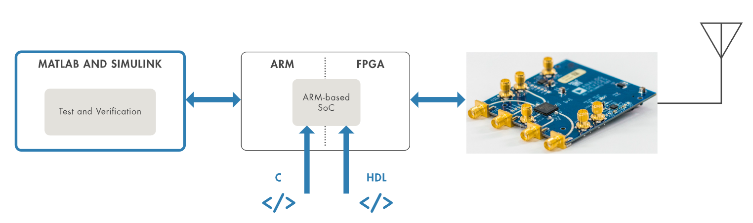 Deploy, prototype, and verify custom designs on SDR hardware using HDL and C code generation from algorithm models.