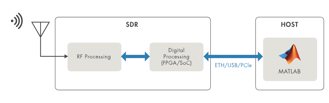 Block diagram of SDR components and connectivity to MATLAB.